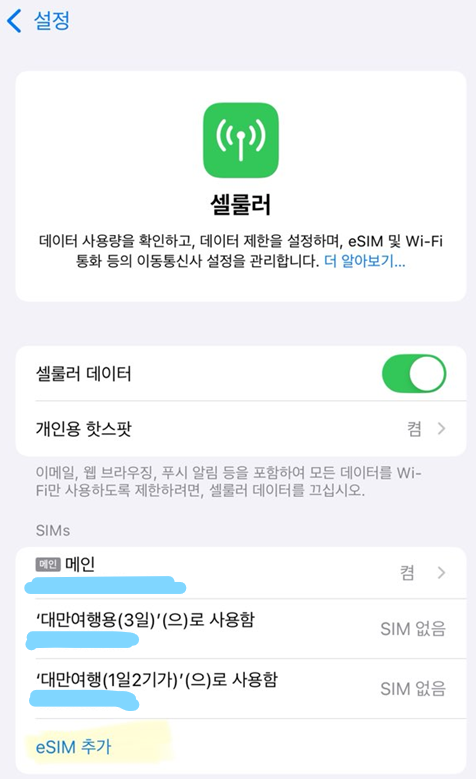 *아이폰 기준: 설정 -> 셀룰러 -> eSIM추가